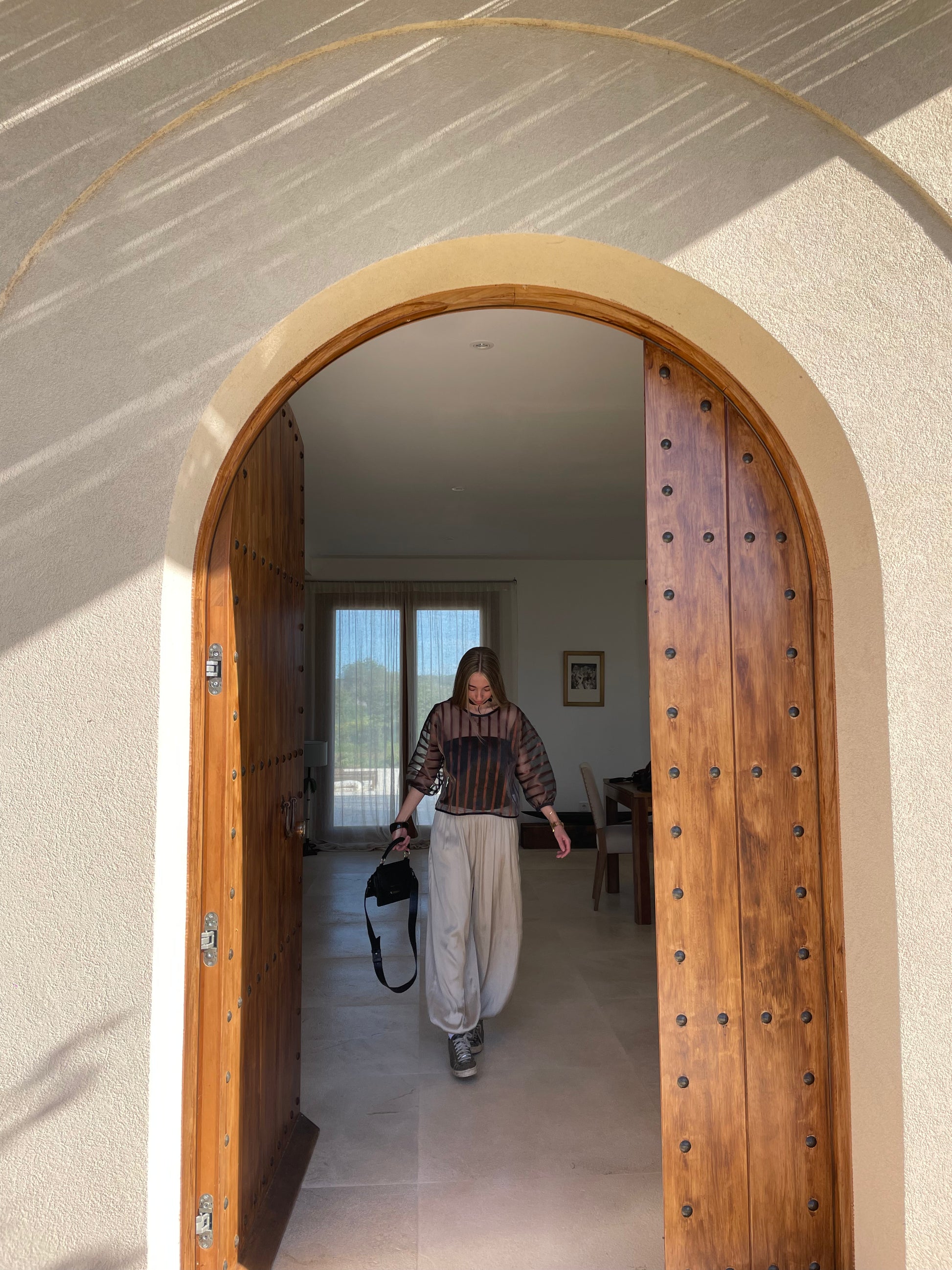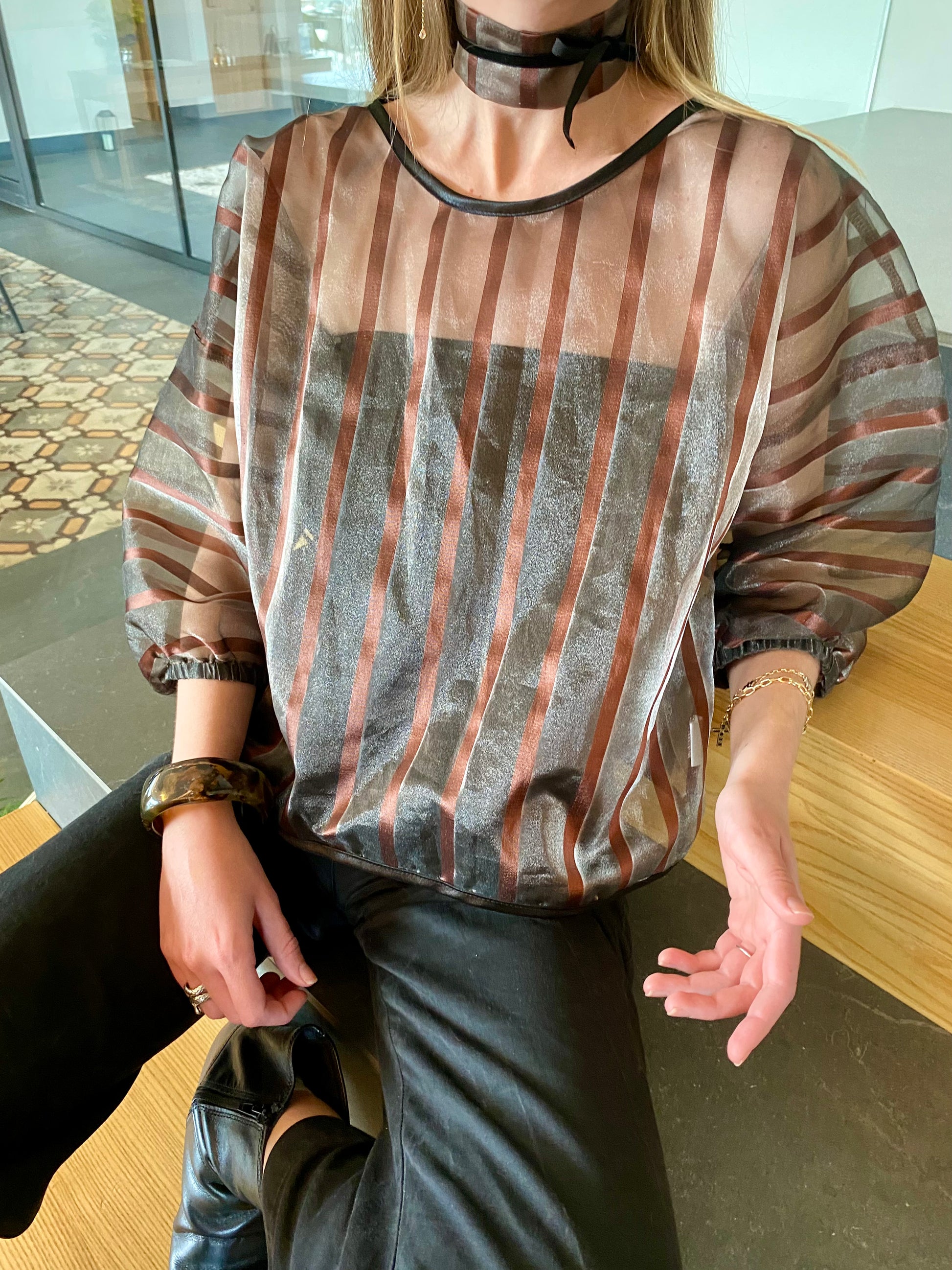 Blusa transparente a rayas marrón y negra. Incluye gargantilla y bandeau negro