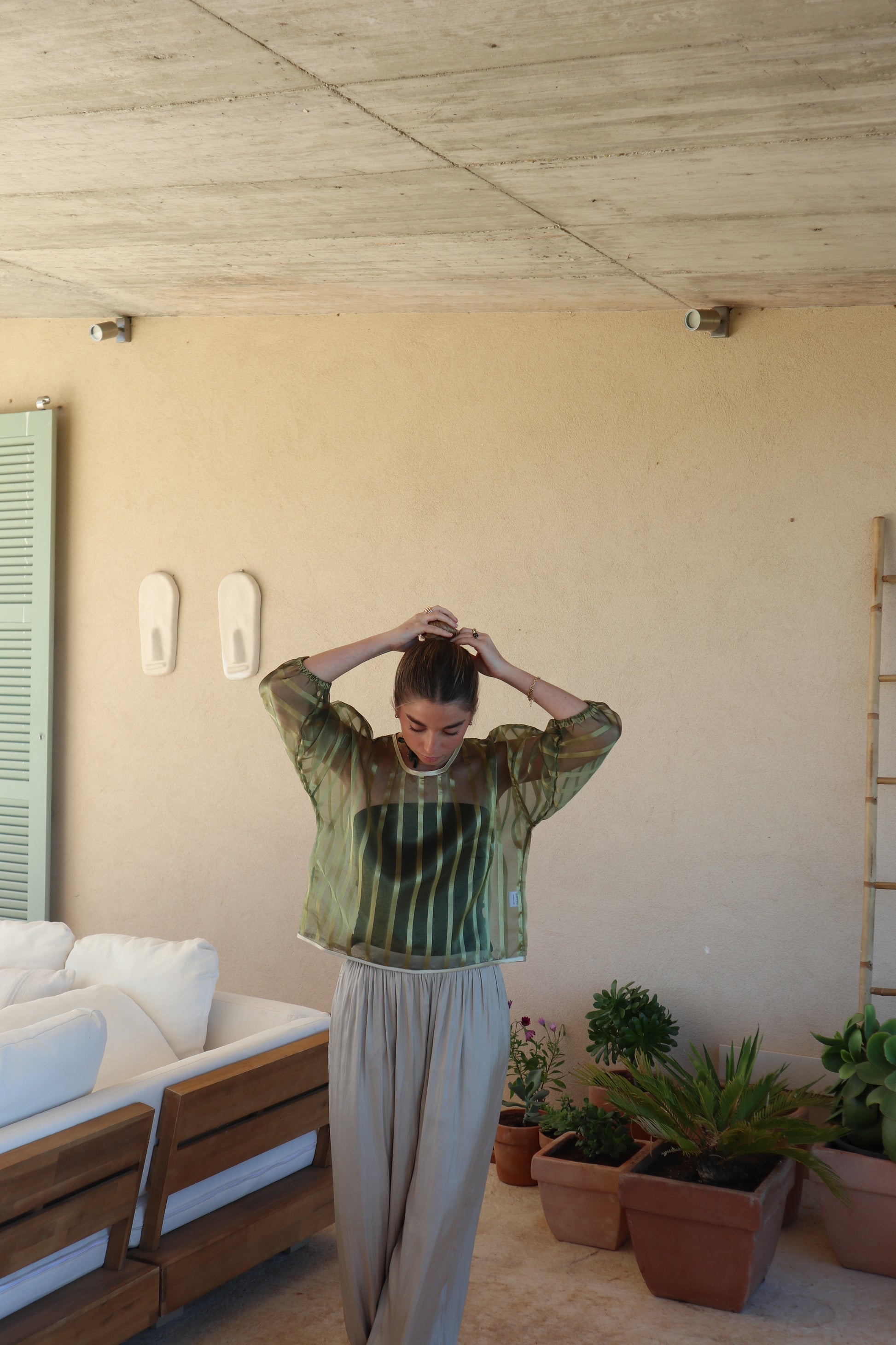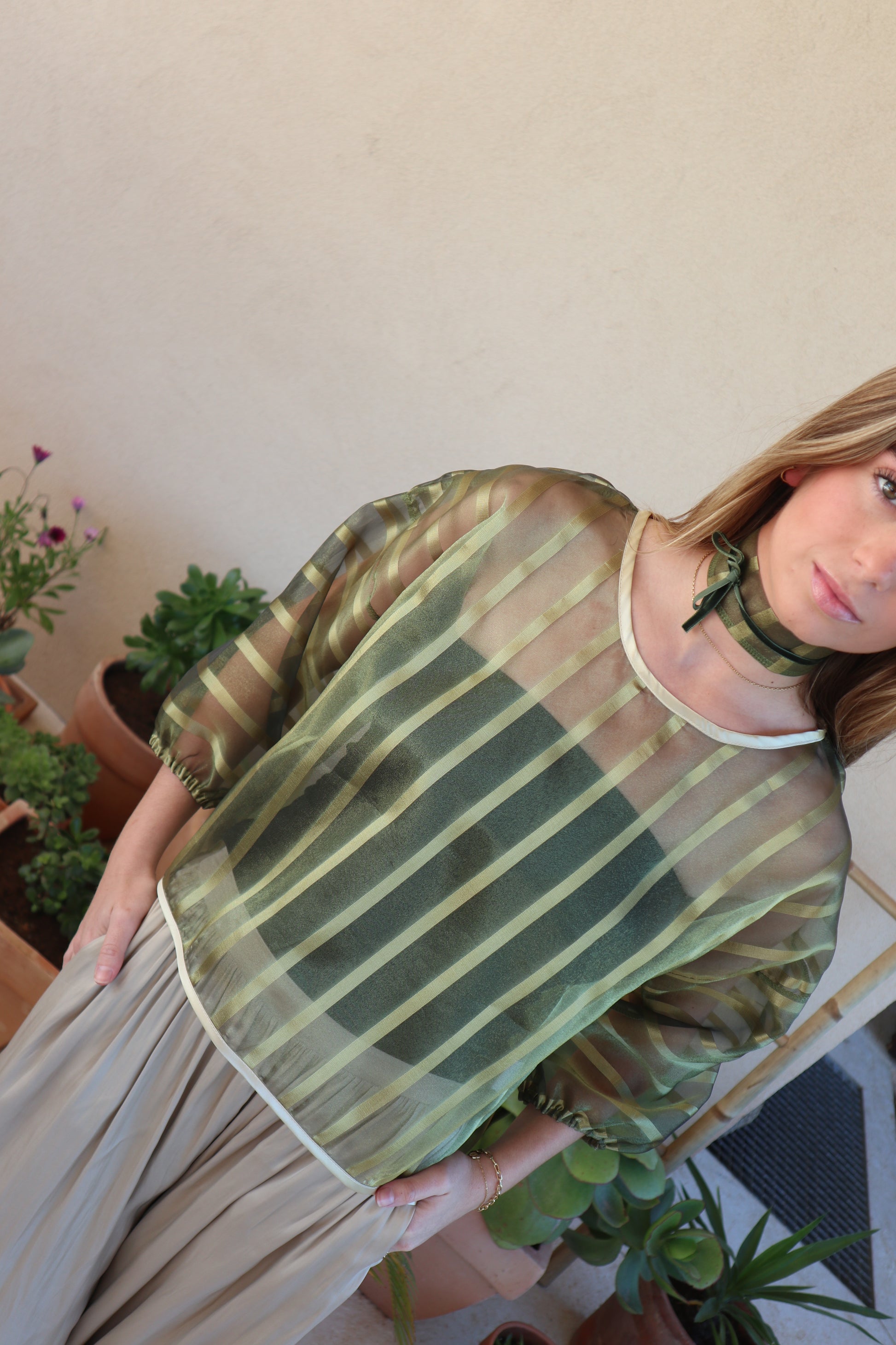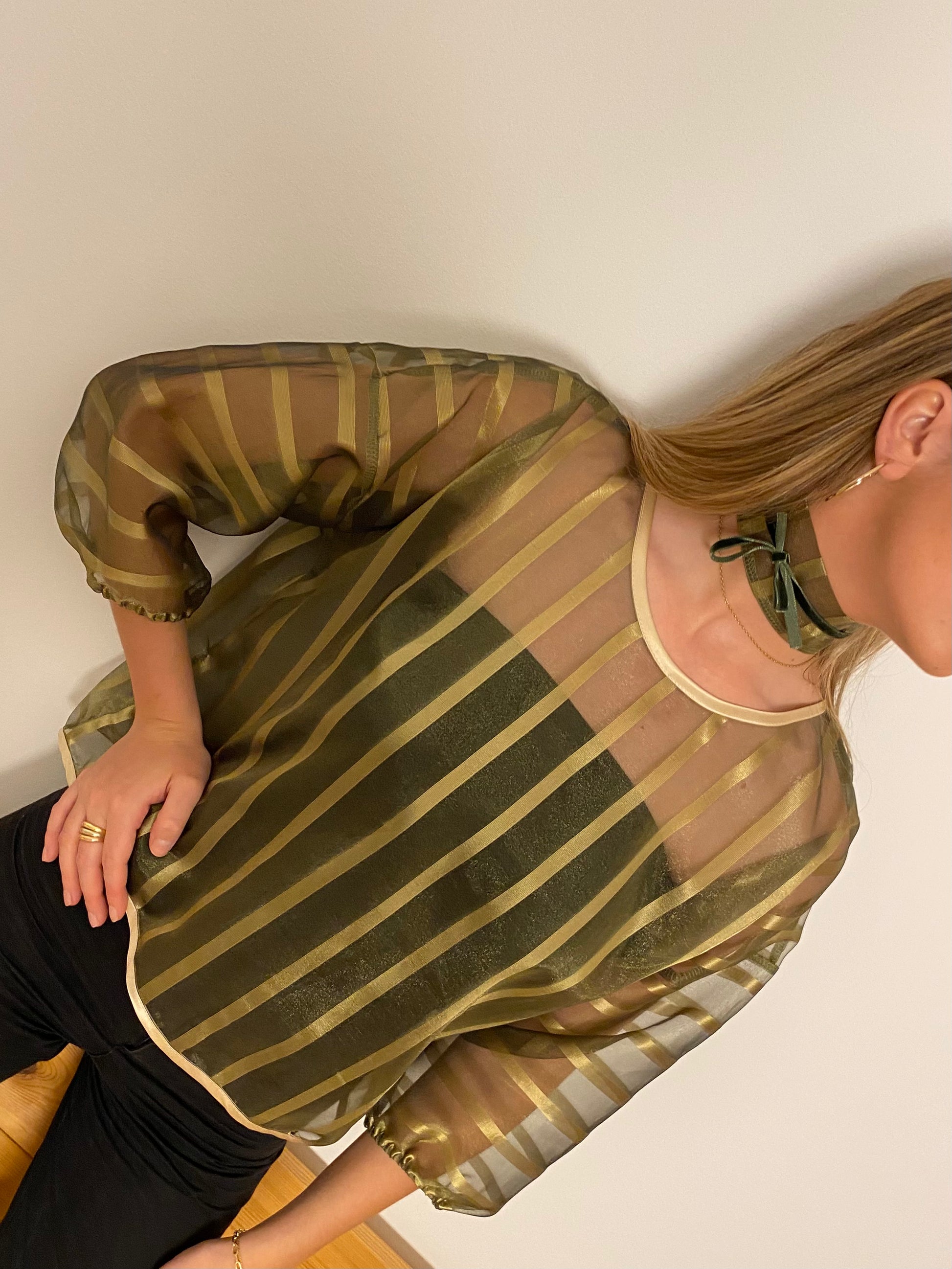 Blusa transparente a rayas verde y dorado. Incluye gargantilla y bandeau negro