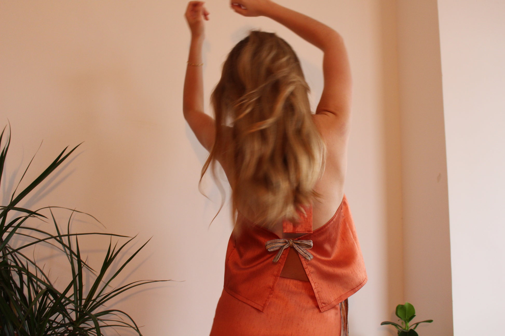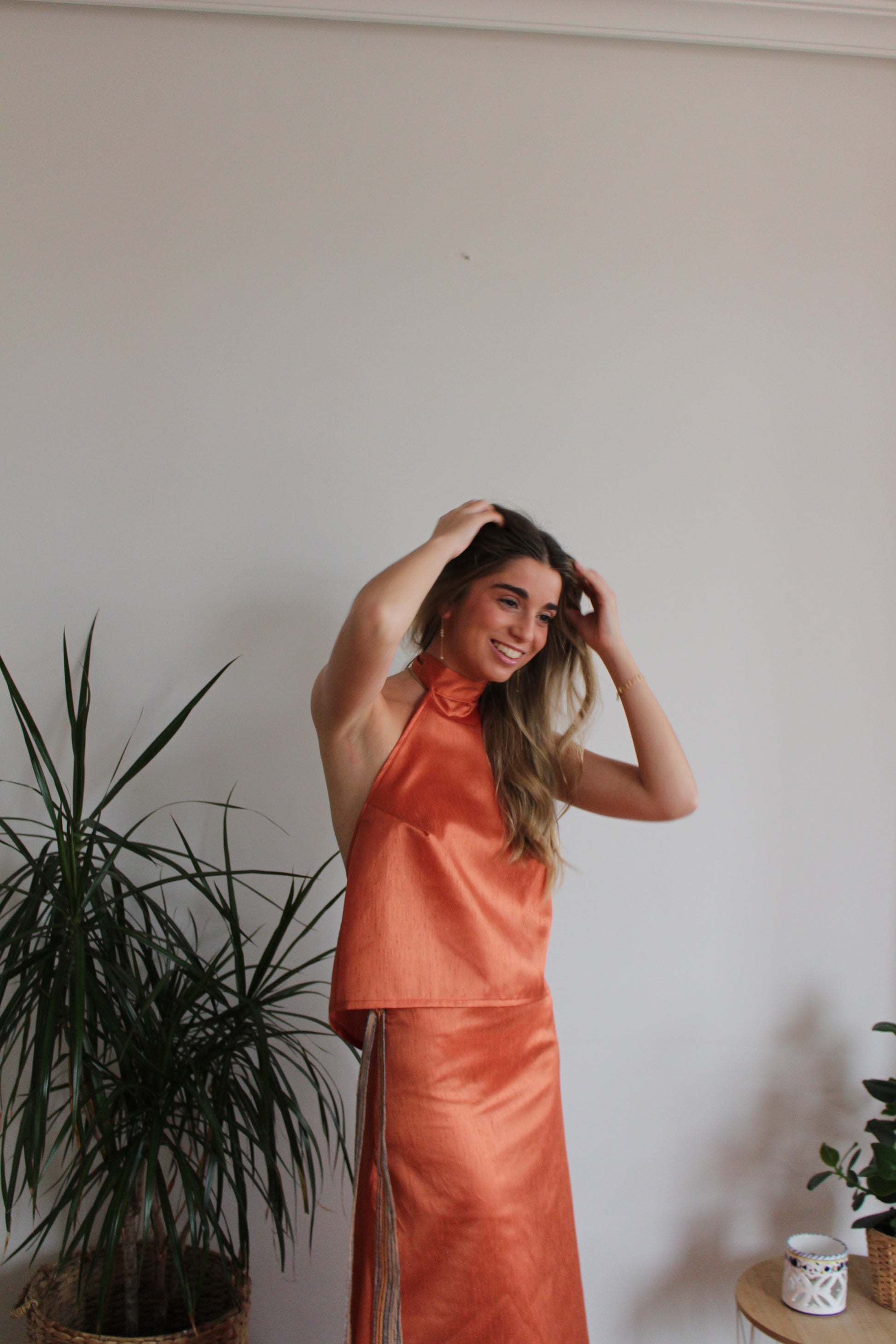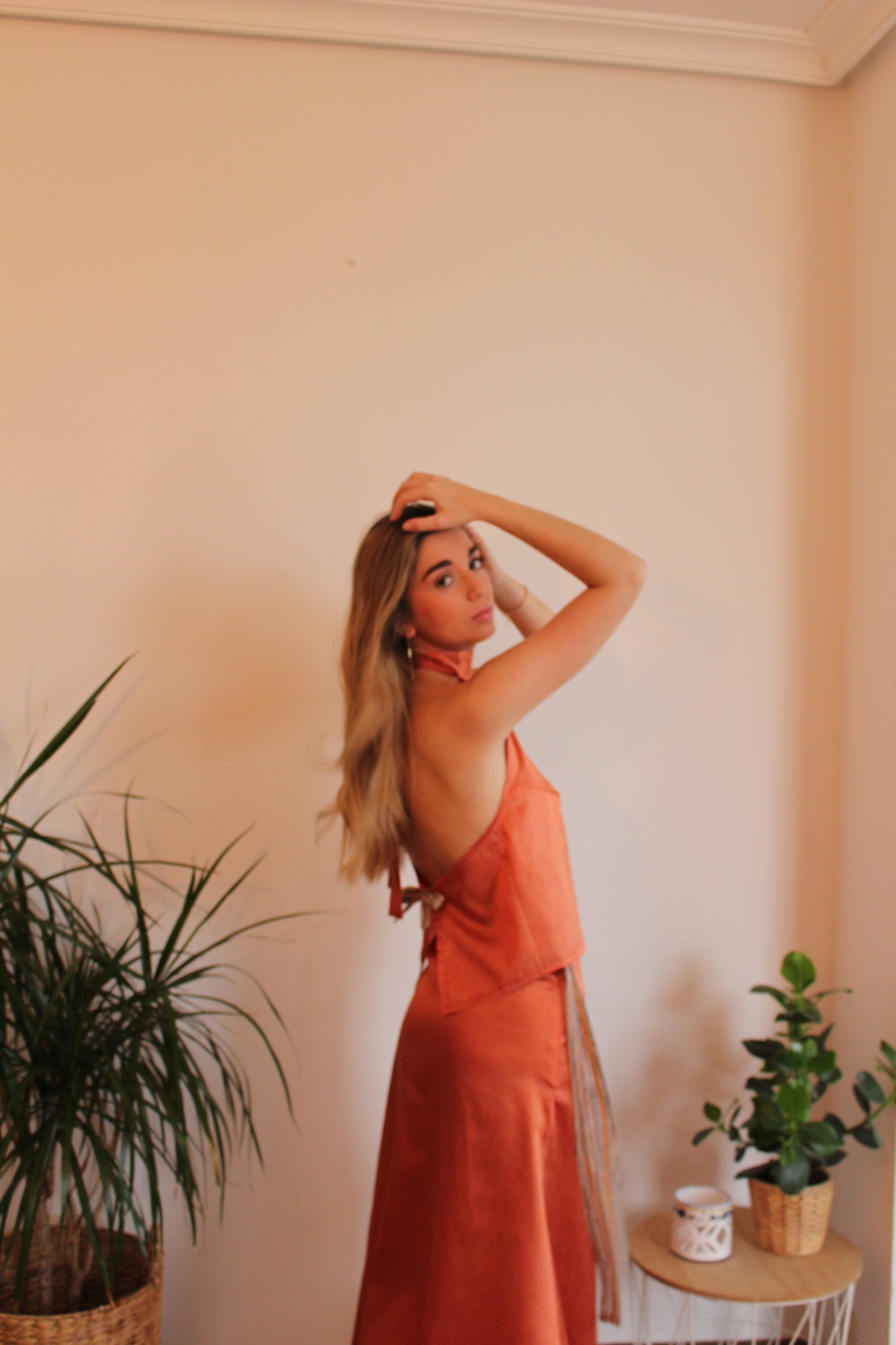 Top color naranja con cuello halter y espalda abierta